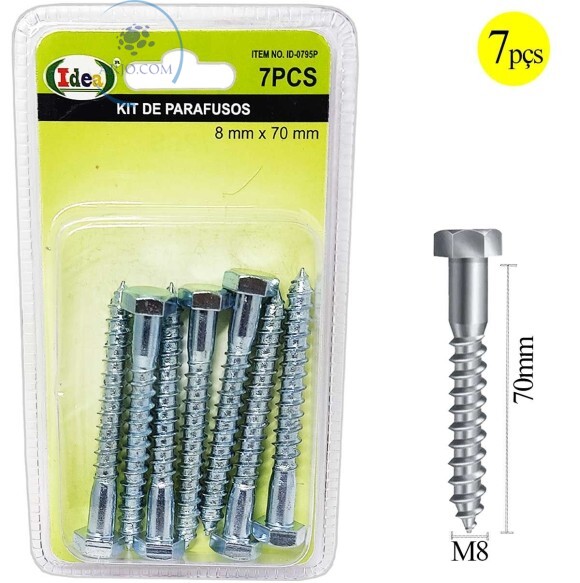 KIT 07 PARAFUSOS SEXTAVADO ROSCA SOBERBA 8mmX70mm (ID-0795P)