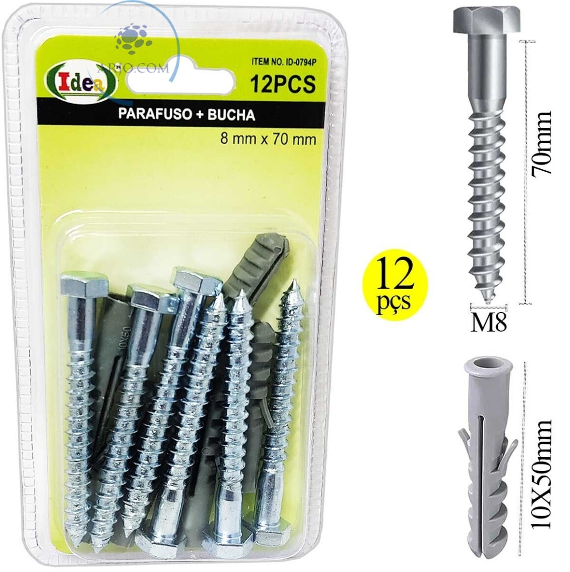 KIT 06 PARAFUSOS SEXTAVADO ROSCA SOBERBA + BUCHA 8mmX70mm (ID-0794P)